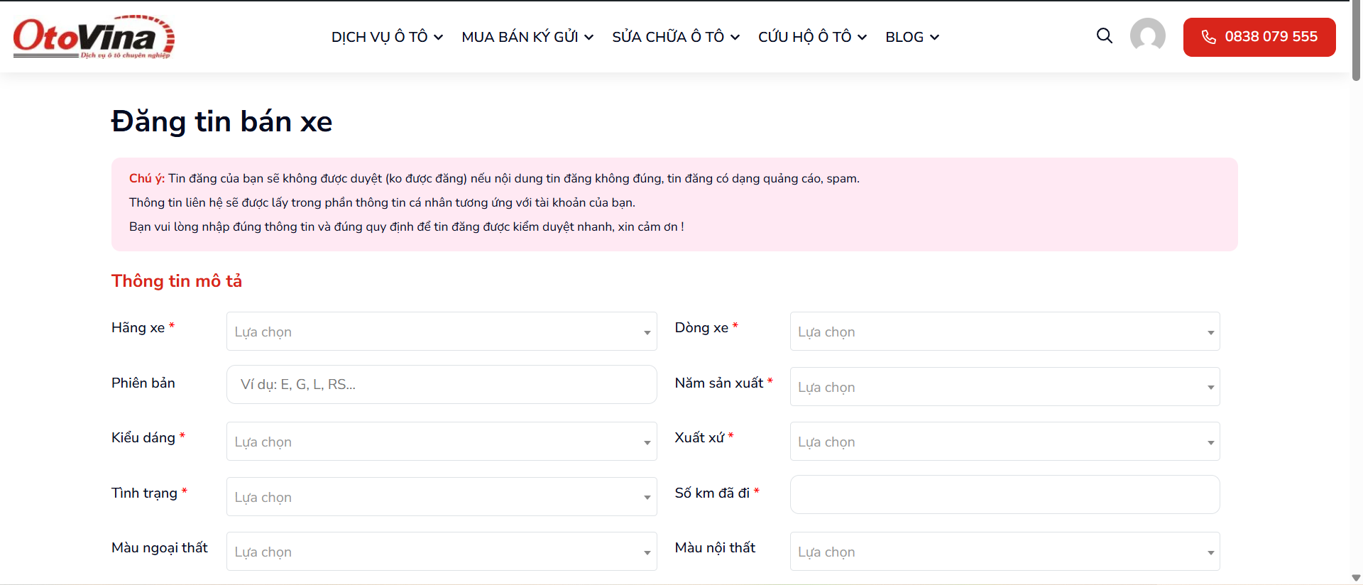 Nhập đầy đủ và chính xác nội dung cho tin đăng, như Hãng xe, Dòng xe, Phiên bản, Giá...