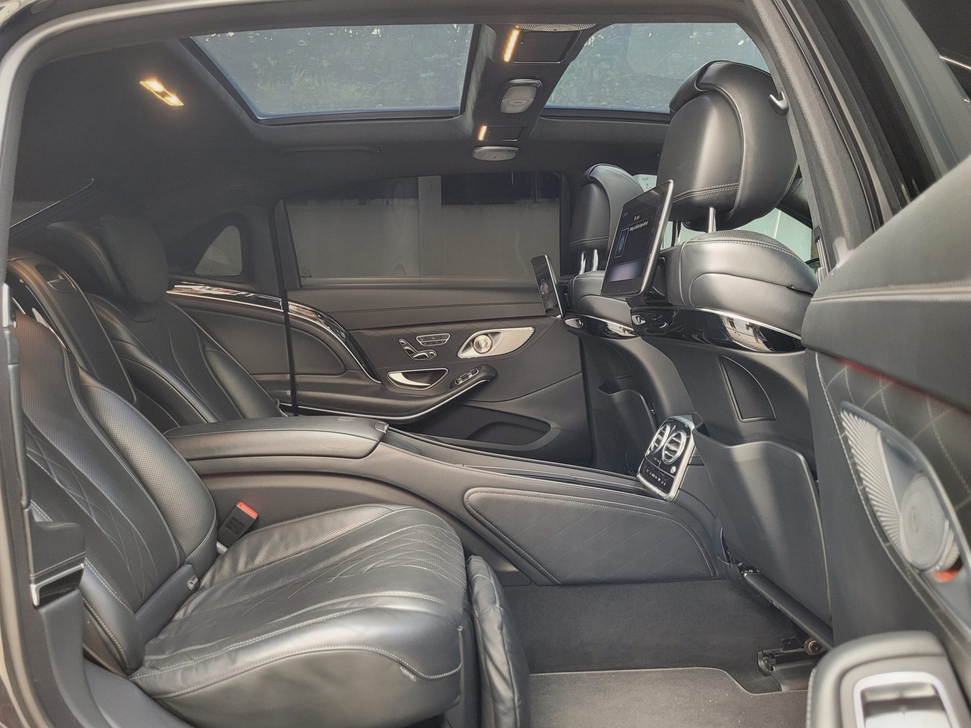 – 2 màn gối đầu giải trí riêng biệt, điều khiển, tai nghe chính hãng,.. Cùng hệ thống loa hiệu Burmester cao cấp,..